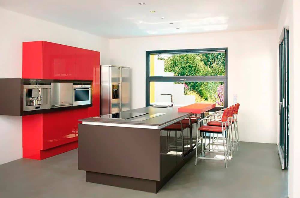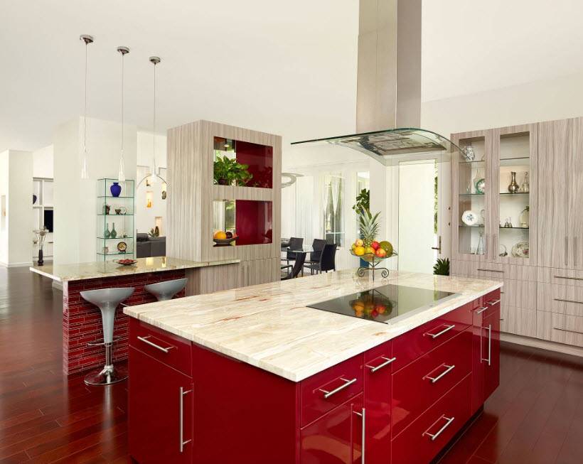 - Пример сочетания серого и красного тонов для обустройства кухонного пространства в интерьере открытой планировки.