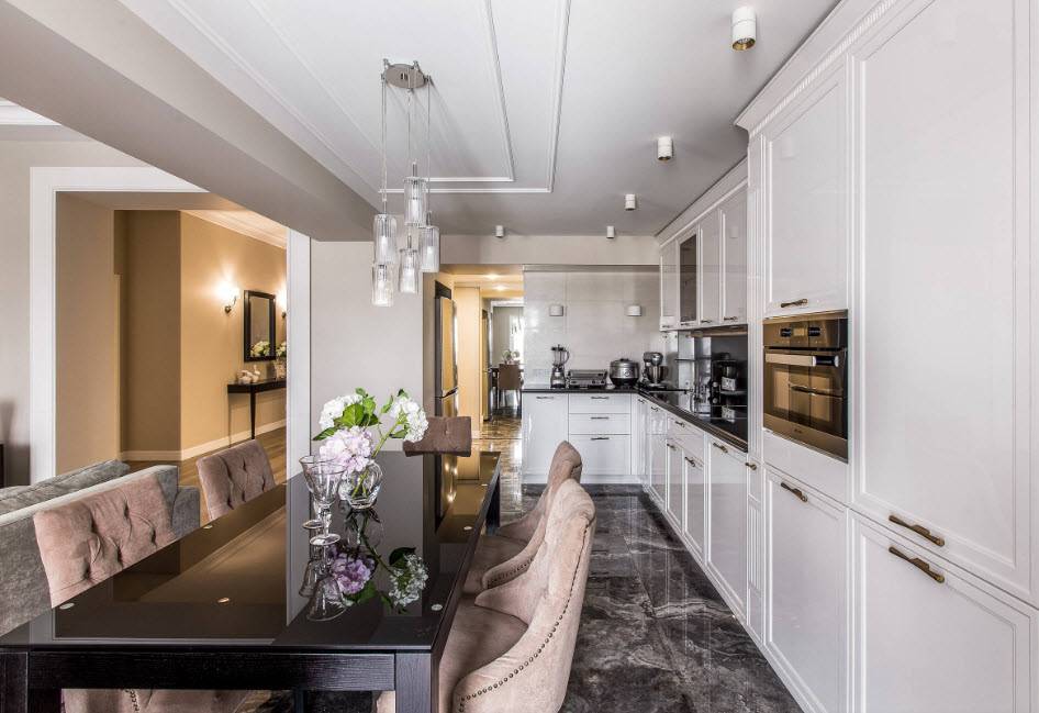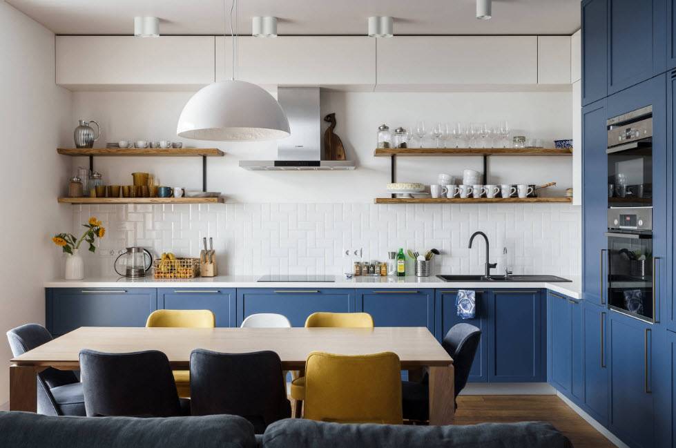 Однако это не значит, что оно должно быть длинным и узким. По форме двухрядные планировки могут представлять собой даже кухню с островком, полуостров и даже со столом. Из-за количества пройденных метров также будут полезны U-образные или L-образные схемы.