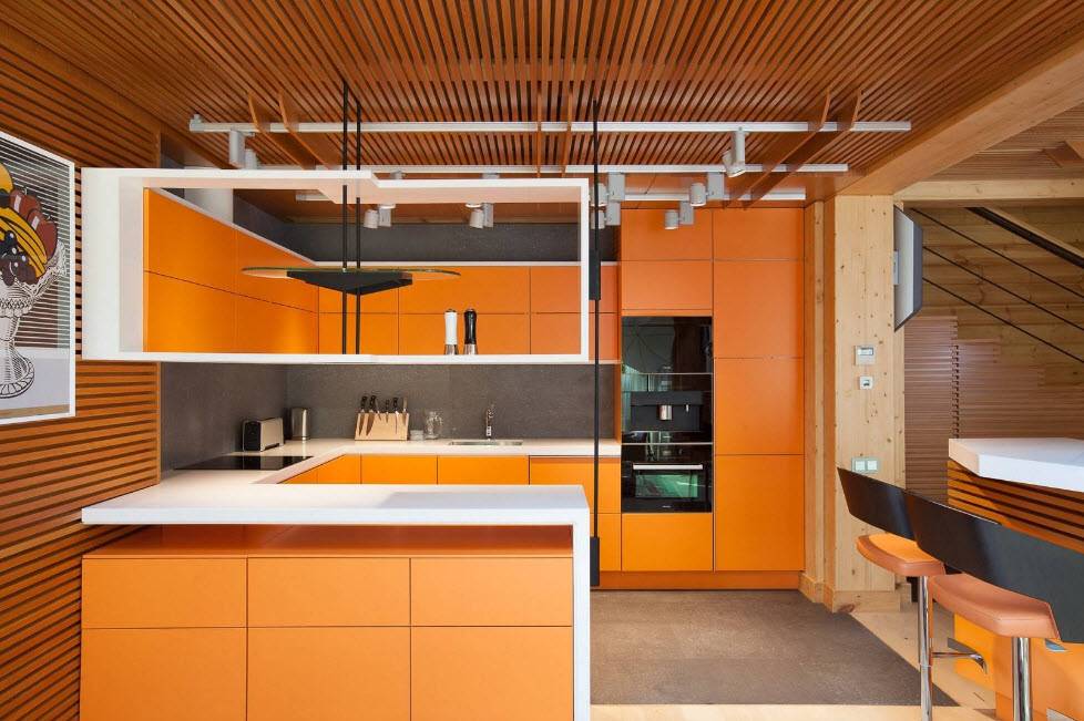 Этот стиль тяготеет к новинкам прогресса, многоуровневости потолка, геометрической тематики узора настенной отделки или фасадов навесных шкафов. Гарнитур в этом случае должен быть непременно глянцевым, а сама кухня должна быть освещена в максимальной мере. Необходимо, чтобы в комнате были элементы обустройства из хрома, стекла и нержавеющей стали. В целом же в комнате нужно создать иллюзию присутствия в клубе.