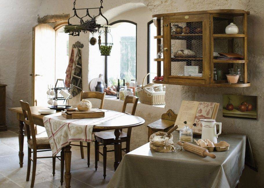 Гармонично смотрится грубая отделка, без лака и полировки. Стол лучше не окрашивать, а вот старинный буфет можно покрыть бежевой или светло-голубой краской, как это делали в деревенских домах.