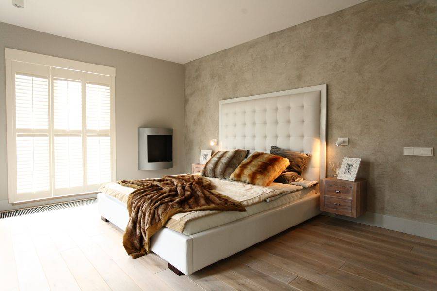 Другая мебель в спальне должна быть функциональной, с гладкой текстурой, простой и желательно в одном — двух приглушенных тонах. Лучше всего положить натуральный материал на пол, например, натуральные деревянные доски согревают интерьер спальни и делают его более уютным. Также, натуральные доски могут украсить одну из стен или стать эффективным продолжением изголовья кровати. Благодаря этой обработке вы получите характерный акцент без добавления лишних предметов.