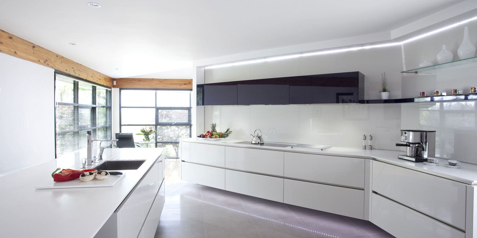 Как и форма кухни, гарнитуры бывают прямыми и угловыми. Если кухня прямая, лучшим вариантом будет установить вдоль одной из стен прямой гарнитур. Шкафы при этом должны быть закрытого типа и без ручек. Вся мебель открывается легким нажатием. Не приветствуются стеклянные полки и открытые ниши. Всю посуду и технику следует спрятать.