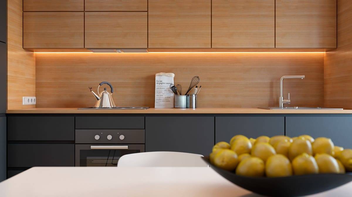 Дерево можно использовать в дизайне столешницы, пола, и даже стен (например, отделать одну их стен деревянными рейками или соорудить из них перегородку в кухне-гостиной).