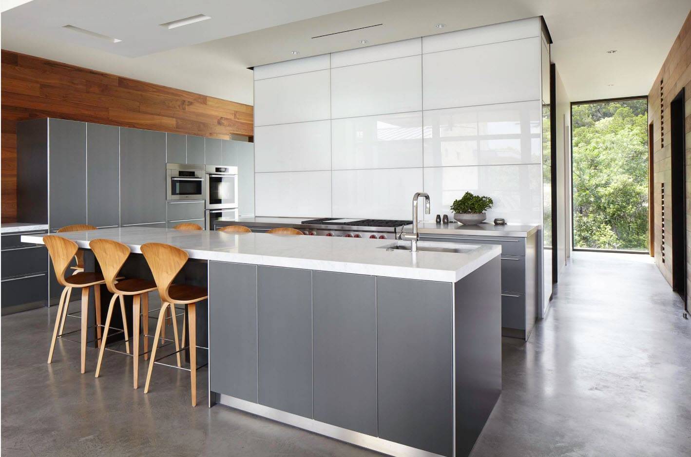 исключительно холодная цветовая гамма, разбавленная «теплым» деревом – как видите, и это не всегда так; ведь вся эта ледяная композиция может заиграть при помощи ярких стульев, фартука или небольших и немногочисленных предметов декора;