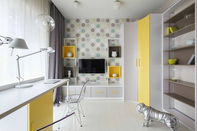 Оживляют обстановку насыщенные желтые, голубые, красные, зеленые, оранжевые, фиолетовые или другие яркие акценты, присутствующие в меньшинстве.