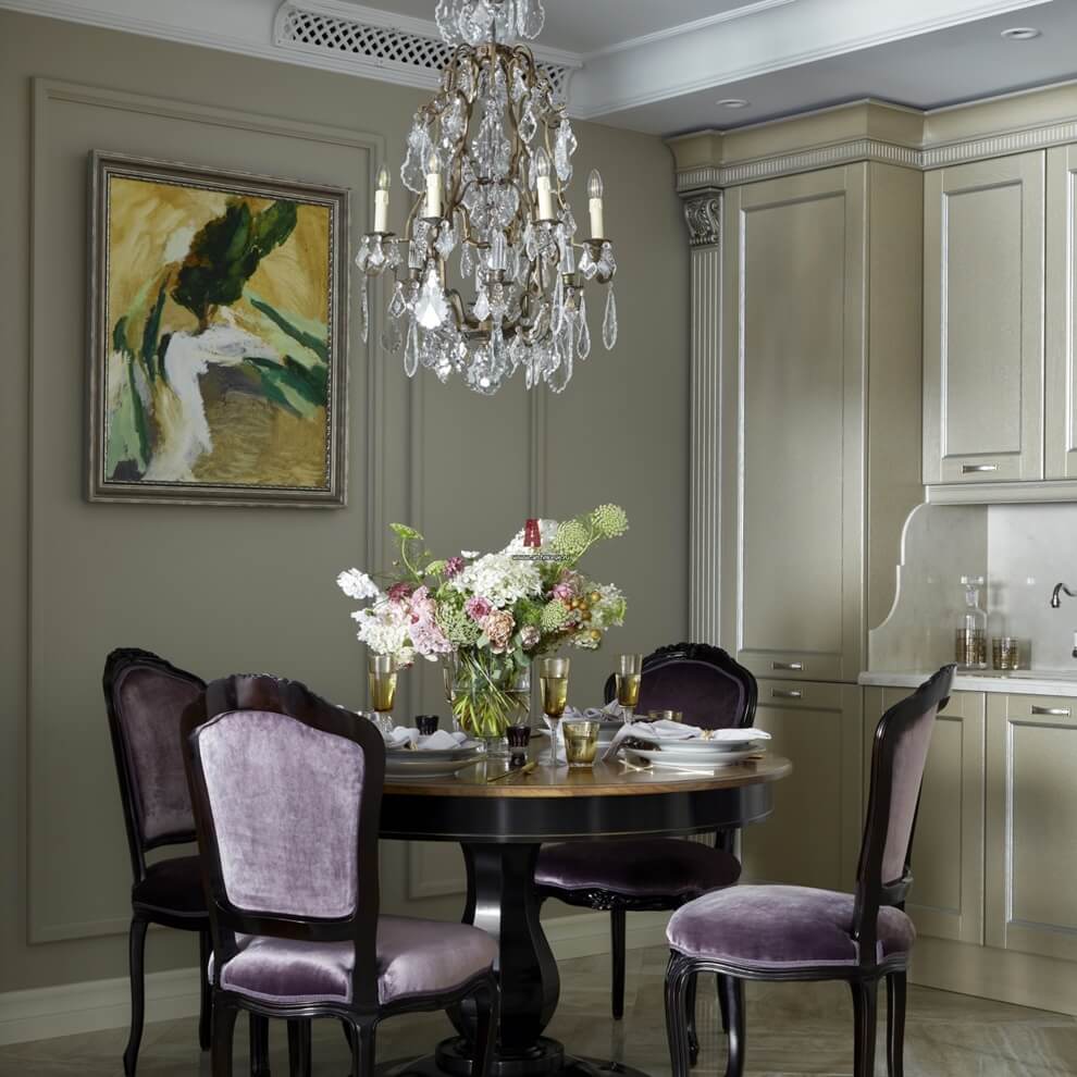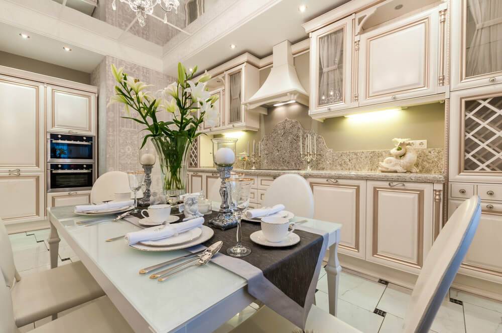 Обеденный стол – основа композиции в пространстве кухни-столовой. Классический стиль позволяет использовать круглые или овальные варианты, позволяющие сделать расстановку стульев удобной, сэкономить место. Уместен будет и небольшой сервировочный столик.