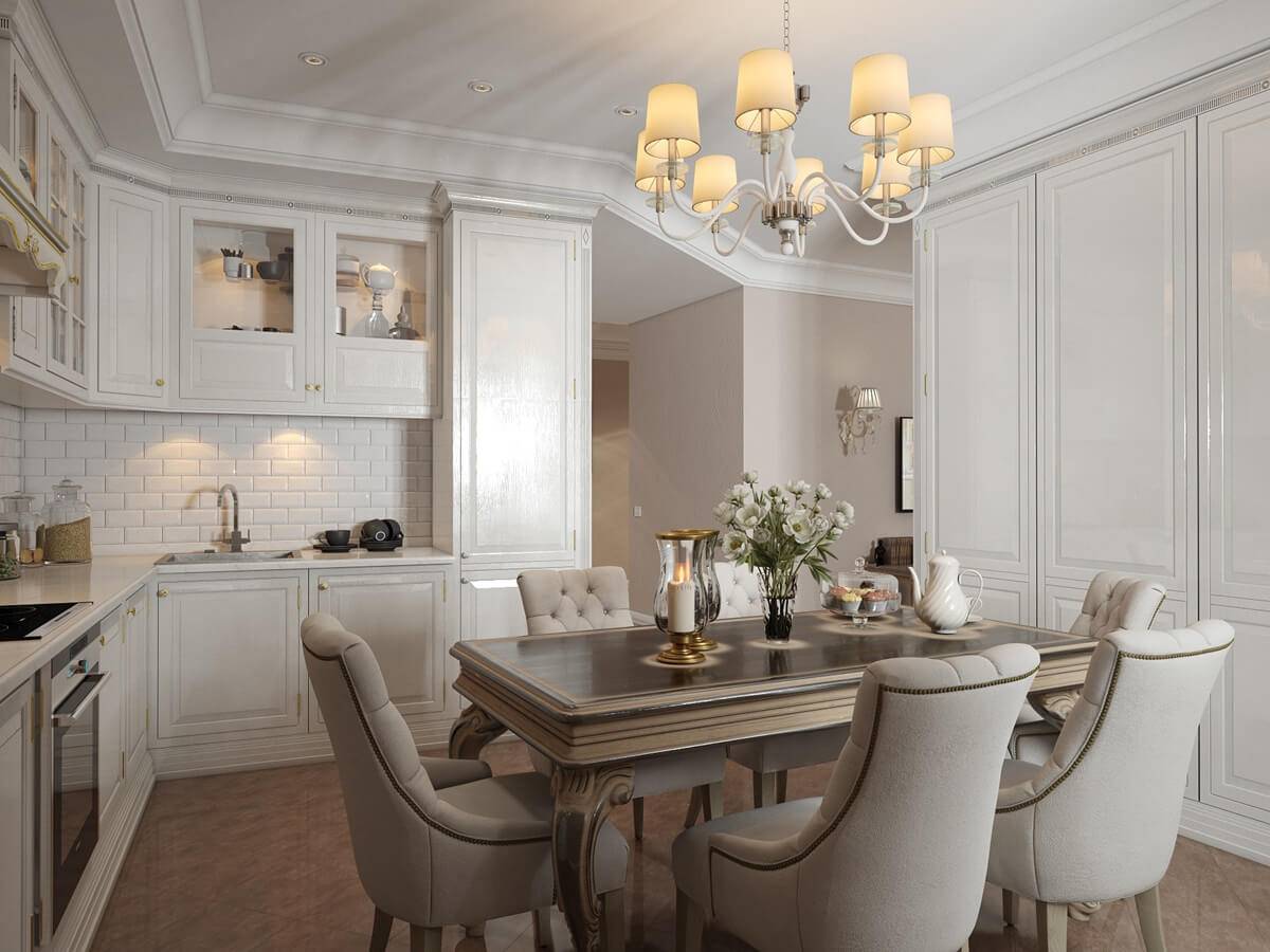 Во многих дизайн проектах кухни неоклассика, например, на фото ниже, используется двухуровневый потолок, в центре которого размещается потолочная ниша, имеющая строгую геометрическую форму – прямоугольную, круглую или эллиптическую. Если в комнате низкий потолок, то можно выделить эту зону условно, с помощью декоративного багета.