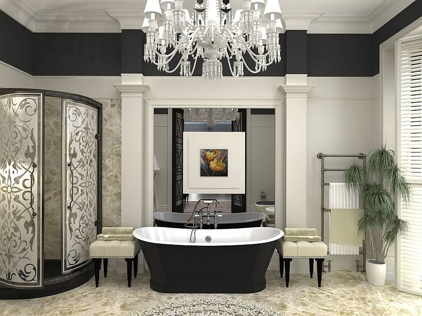 Независимо от площади ванной комнаты, в ней легко удается организовать неоклассический дизайн. С помощью элементов декора легко дополнить комнату так, чтобы она соответствовала своему назначению.