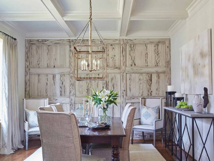 Панели. Еще один интересный вариант для отделки стен. Одинаково хорошо в стиле шебби шик будут смотреться пластиковые панели с имитацией плитки или дерева, или более дорогие модели из натурального дерева. Панели лучше выбирать цвета беленого дуба, березы или бука. Не менее эффектно будет смотреться поверхность, обработанная морилкой.