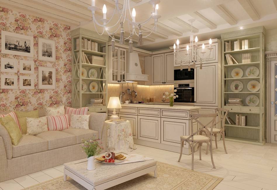 Мебель должны быть витиеватой. Желательно обходить грубую геометрию. Основной рабочий гарнитур вполне может использоваться в стиле модерн, но его также нужно будет состарить. Отличным цветом для этого будет белый или голубой. Также можно покрасить гарнитур в оливковый. Если первоначальный цвет мебели темный, то проступающие «трещинки» будут смотреться очень органично. Для этого также стоит предварительно зачистить и обработать некоторые места парафином.