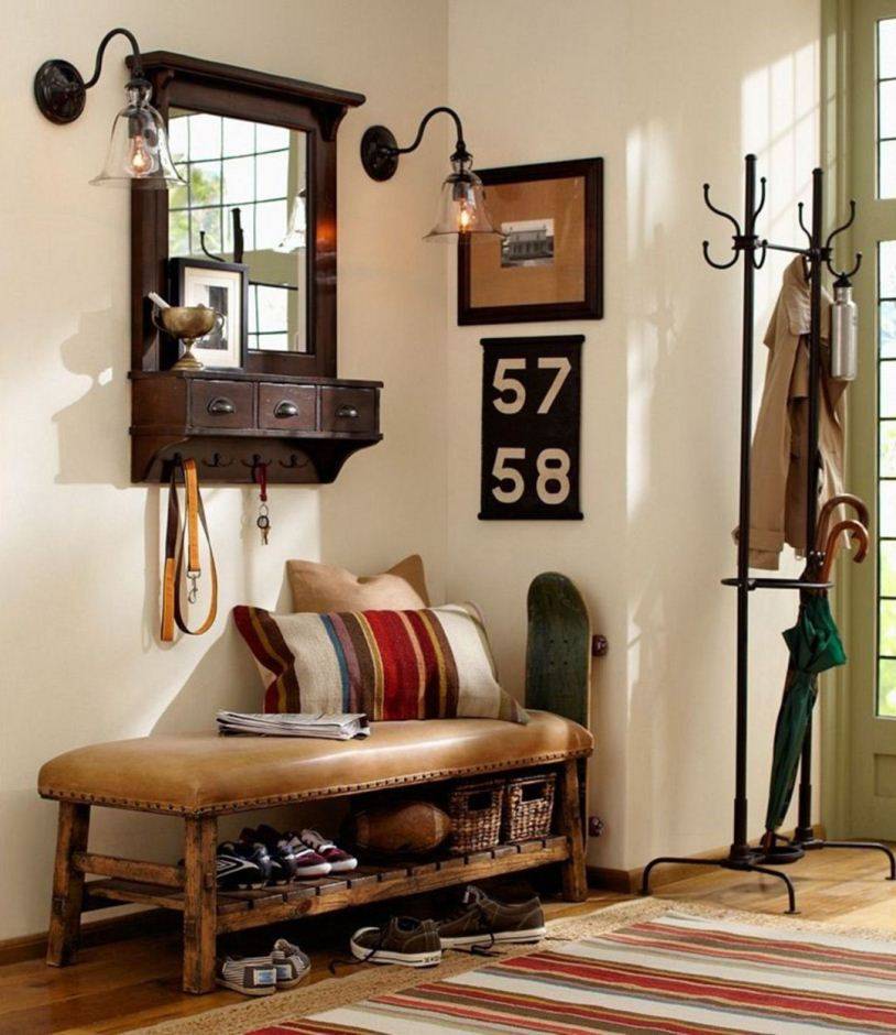 Винтажную прихожую можно украсить небольшим комодом и тумбой. Желательно декорировать их потертостями на краях. Дополнит интерьер пуф классической формы и расцветки.