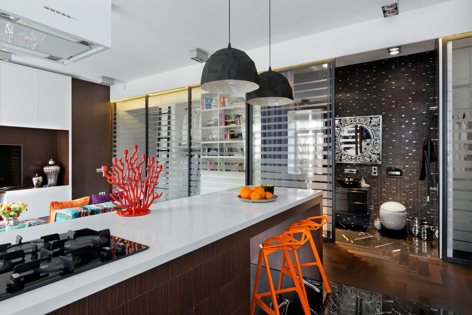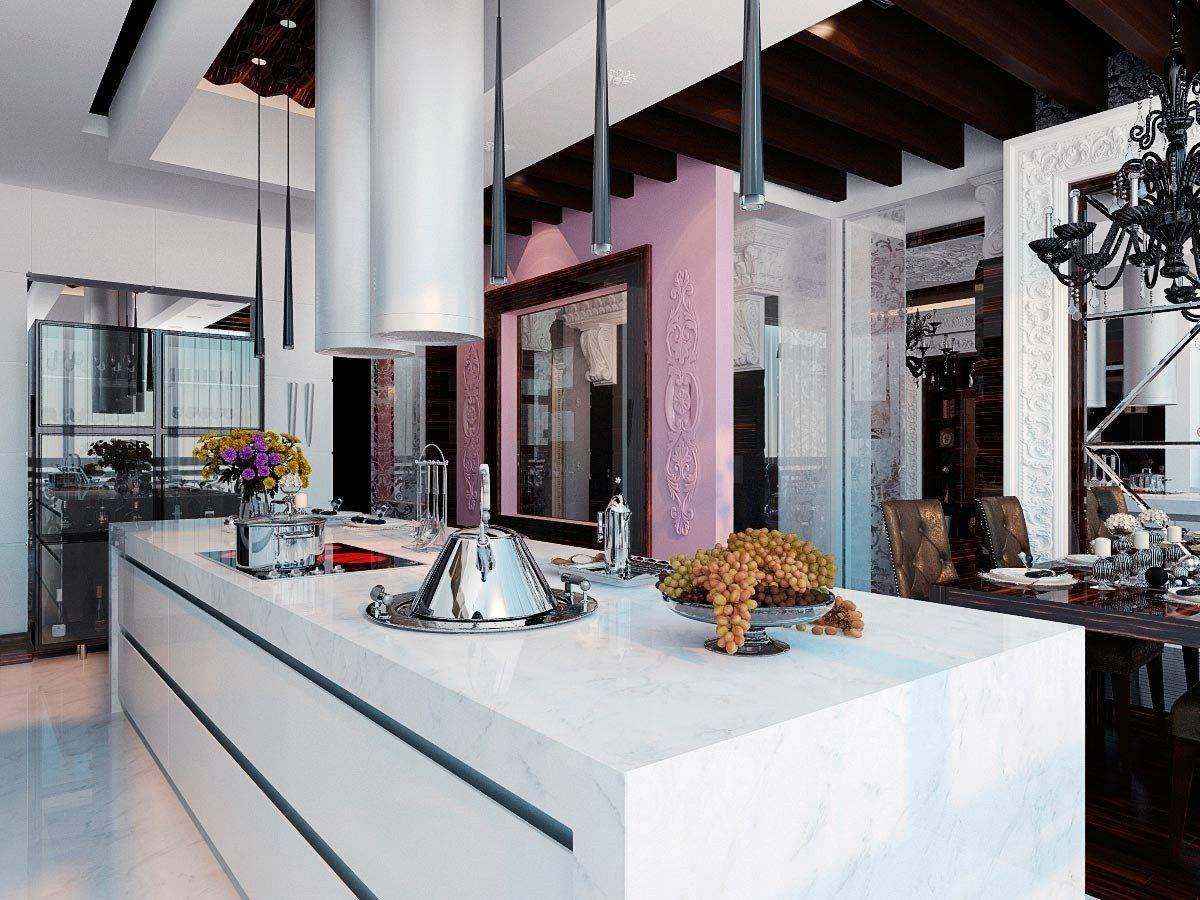 Комбинирование. Не бойтесь в классический интерьер приносить современные тенденции – встроенная техника в духе минимализма, натяжные потолки, стеклянные фасады.