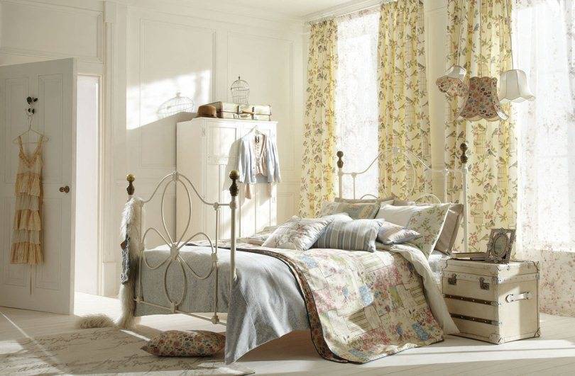 В такую спальню идеально впишется завалявшийся бабушкин комод, трюмо или любая другая мебель, которую давно пора бы уже выбросить. Если она не отличается своим товарным видом, то ее можно покрасить или красиво оформить своими руками, например, в технике декупаж. Прекрасным дополнением к дивану или кровати станут подушки любых цветов, украшенные рюшами или оборками.