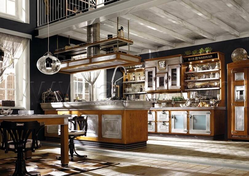 Основная роль при создании тематического оформления отводится мебели. Необходимо подобрать меблировку, при взгляде на которую не будет оставаться сомнений, что это кухня, декорированная в соответствии с тенденциями прошлых периодов.