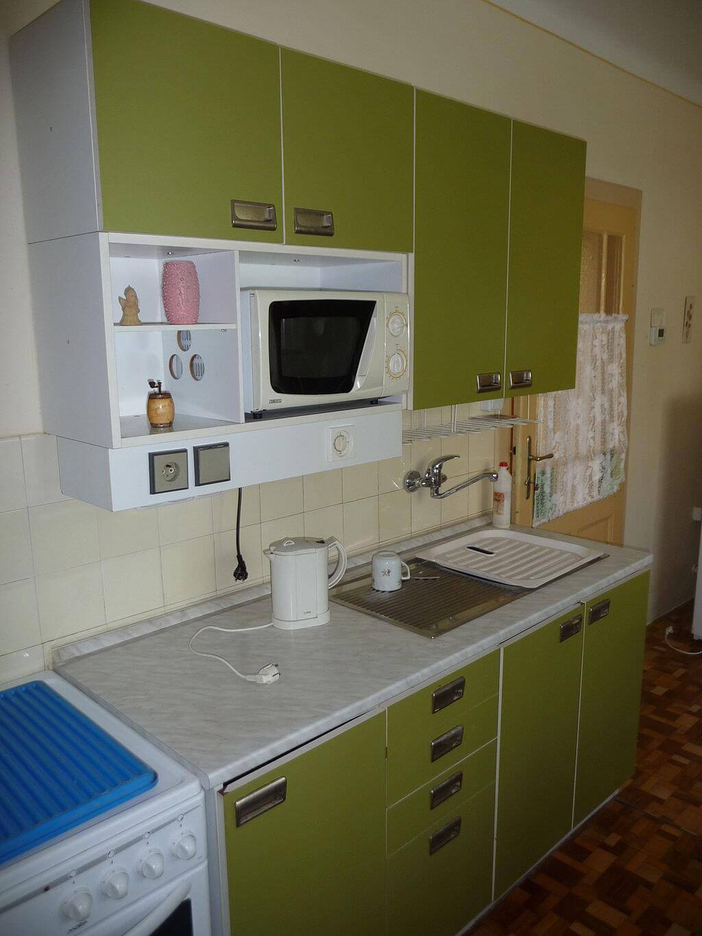 Зеленые стены кухни обеспечивают приветственный дизайн комнаты.