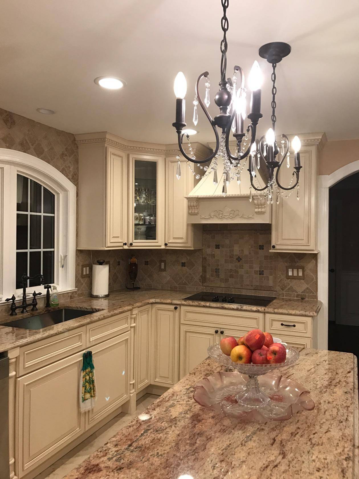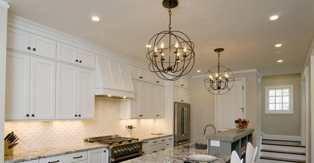 На кухне в классическом интерьере обязательно должен присутствовать один основной мощный источник света. Чаще всего это массивная люстра, расположенная прямо над обеденным столом.