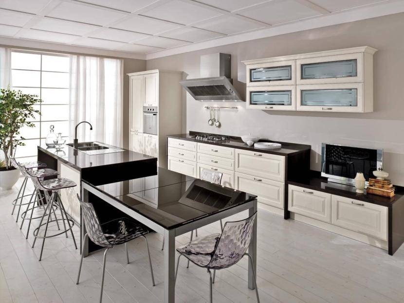 В кухне предметы во многом зависят от Вас, если Вы холостяк, то крупногабаритный стол Вам ни к чему. А для большой семьи потребуется не только крупногабаритный, а так же много шкафчиков, в которых будут храниться приборы для приготовления пищи.