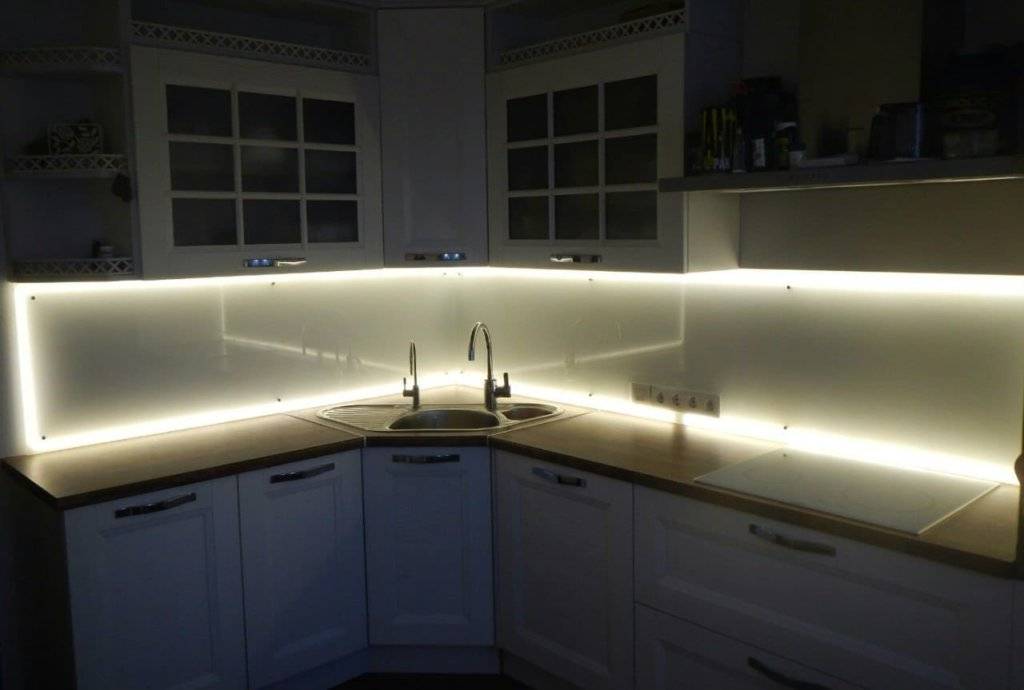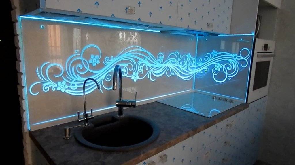 Фартук с подсветкой, если он из стекла всегда смотрится здорово. Самый удобный способ создания дополнительного освещения – установка ленты светодиодов.