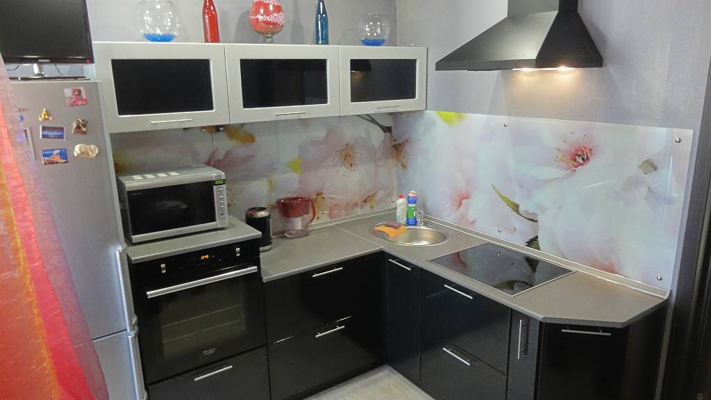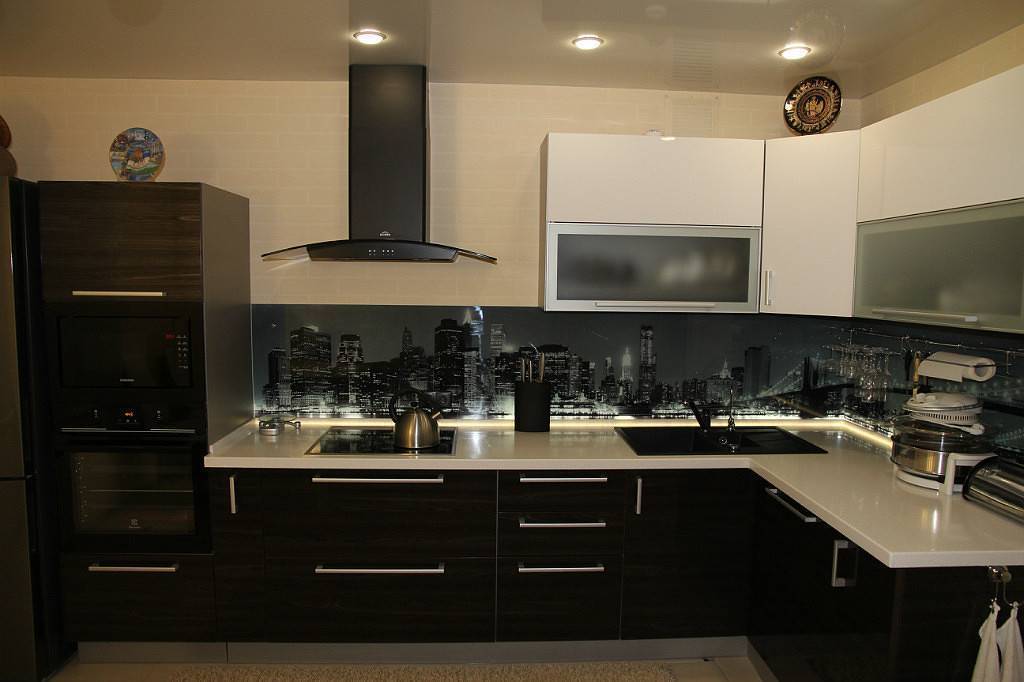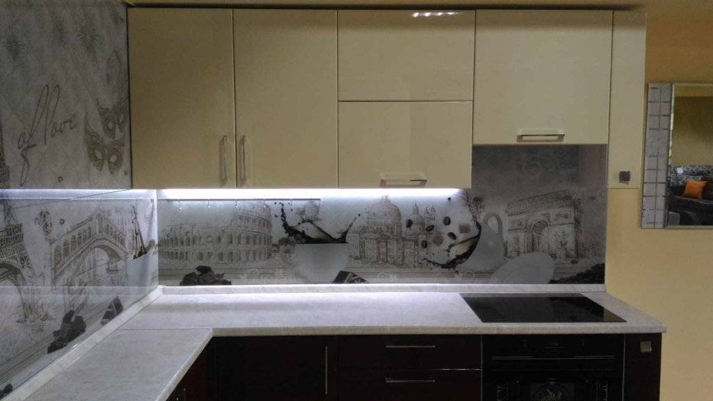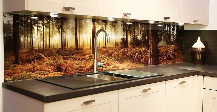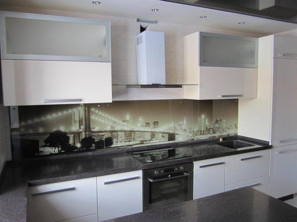 - скинали – стекло с подложкой. Это может быть обычная виниловая пленка, наклеенная с обратной стороны (и поэтому полностью защищена от воды и пара), или фотопечать. Последний вариант намного дороже, но гораздо долговечнее и интереснее, если судить по отзывам обладателей такого фартука.