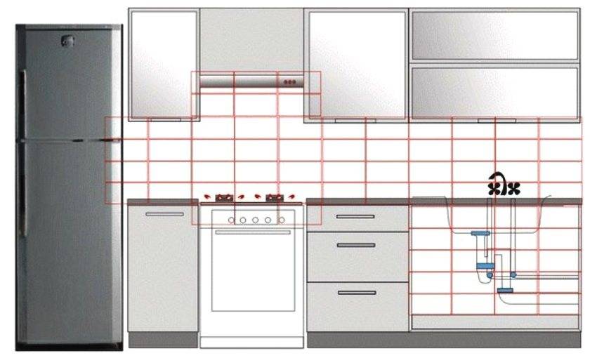Схема облицовки кухонного фартука с укладкой кафеля за плитой и мойкой