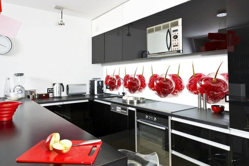 В черной или темной кухне яркие стеклянные фартуки играют роль необходимой цветовой разрядки. Для кухонь в стиле модерн скинали может играть роль цветового акцента — тогда нужно выбирать чисто-белые или насыщенно-красные цвета. Если вы боитесь, что глаза устанут от такой насыщенности — остановите свой выбор на на теплых, неярких оттенках.