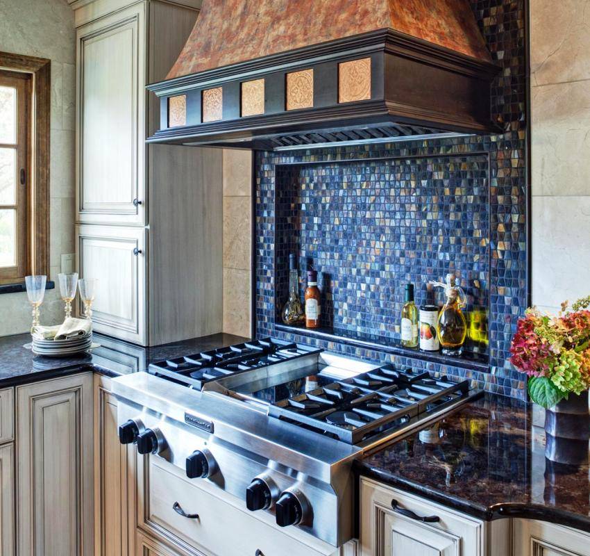 Ниша над газовой плитой облицована мозаикой синего цвета