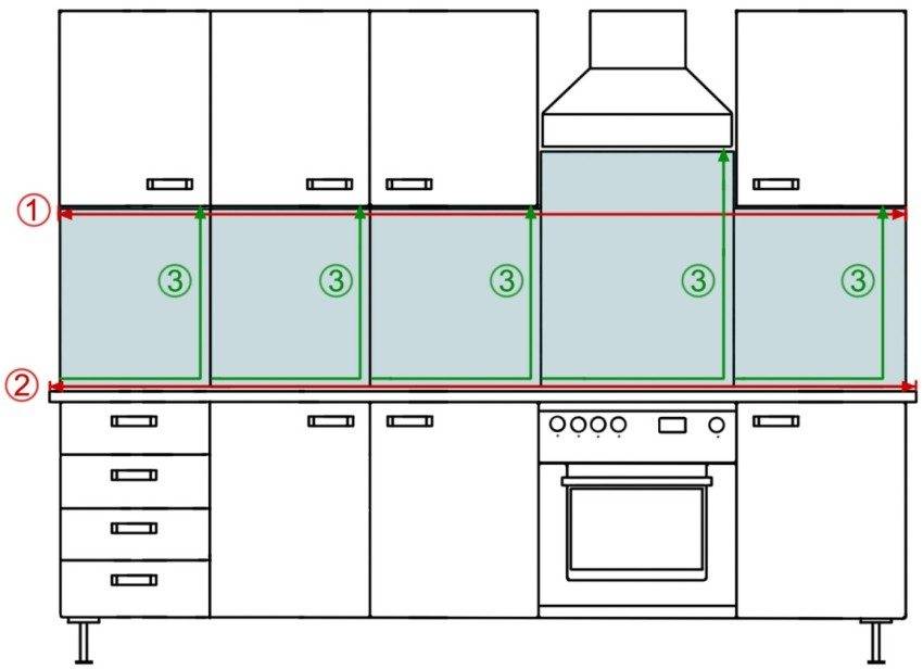 Инструкция для корректного замера: 1 — ширина фартука по нижней линии подвесных шкафов; 2 — ширина фартука по верхней линии нижних тумб; 3 — высота фартука в разных точках просвета между мебелью