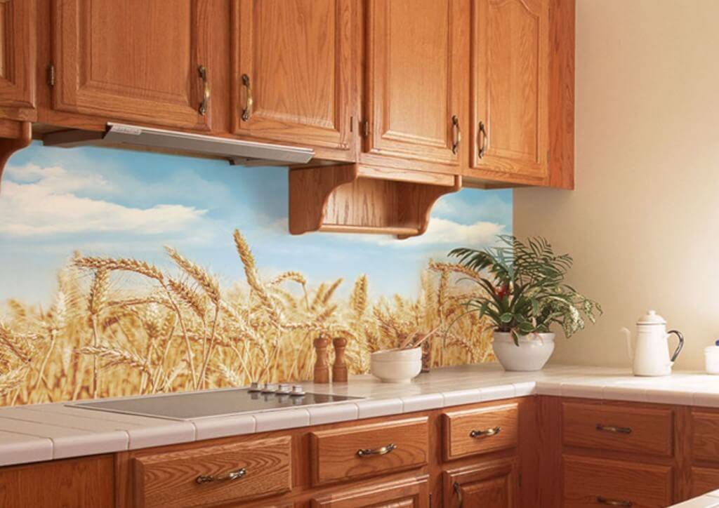Если хотите бюджетный фартук, на котором есть рисунок, этот вариант подойдёт. Ведь он дешевле, чем тот, что с УФ-фотопечатью. Плёнка помещается изнутри на стекла, поэтому находится под защитой от резких смен температуры, воздействия влаги.