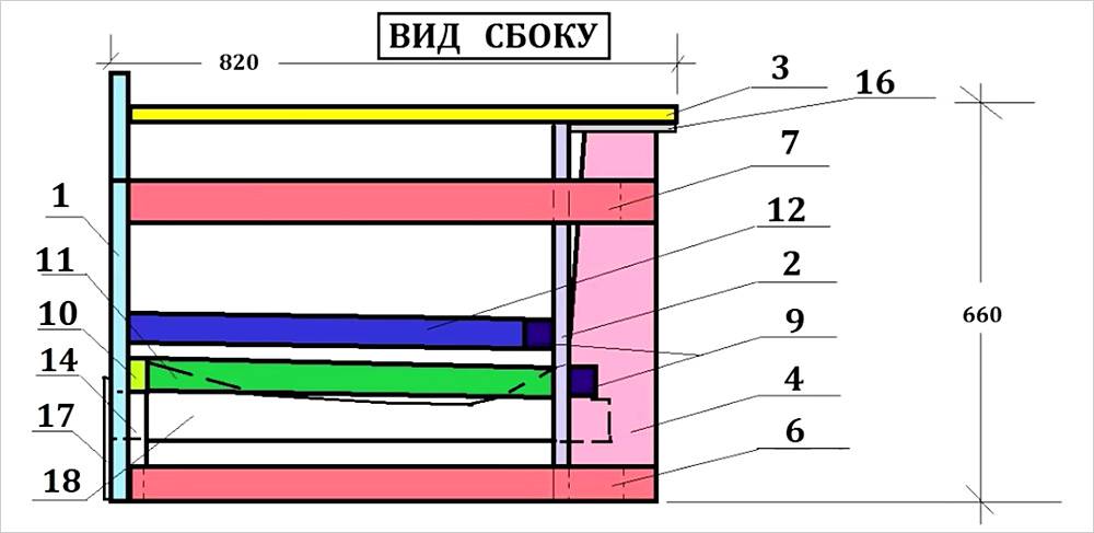 Уголок делают, руководствуясь параметрами кухни. На схеме видны все детали, поэтому подробные чертежи не потребуются.