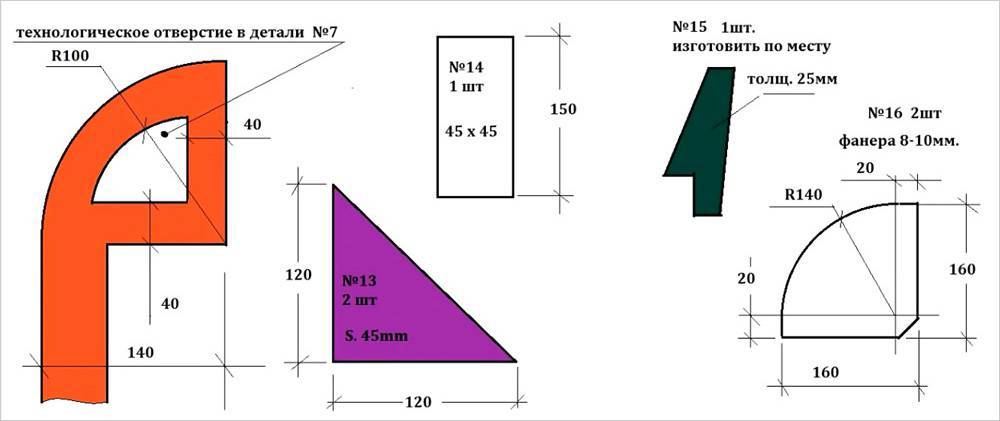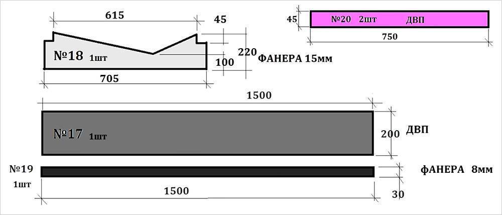 Боковины, лицевую сторону ниши, планку для сиденья и верхнюю планку для спинки делают из ламинированной ДСП, остальные из шлифованной. Боковин нужно будет 2 штуки, другие части – по 1.