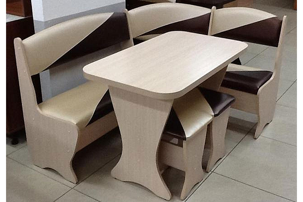 В стандартный комплект мебели для обустройства обеденной зоны входит стол, угловой диван и табуреты.