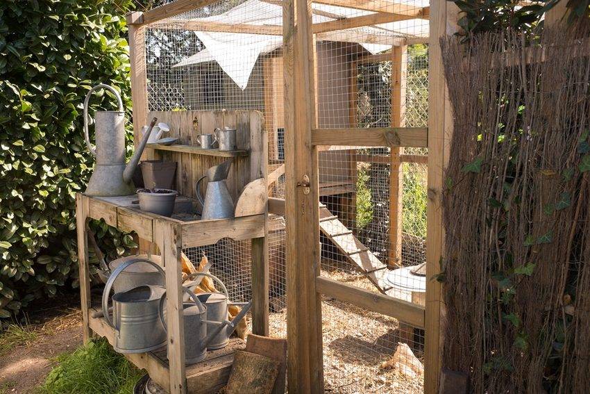 Если крыша прогулочной территории не накрыта шифером, ставьте кормушку под домик, избегая намокания корма дождем. Недалеко от кормушки поместите поильник.