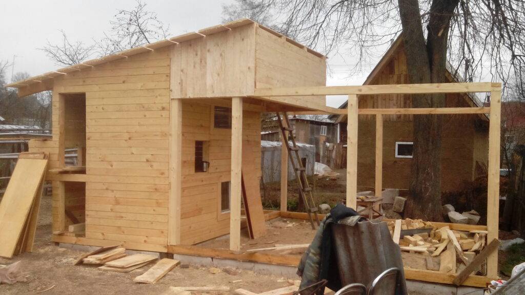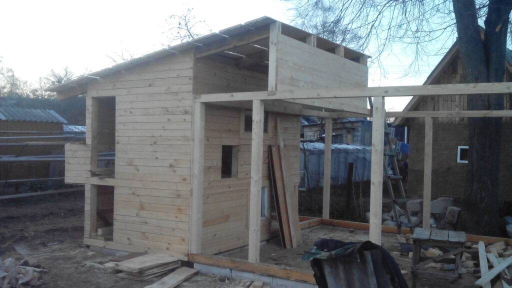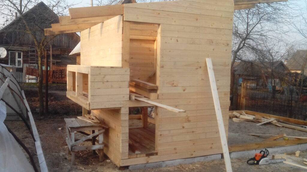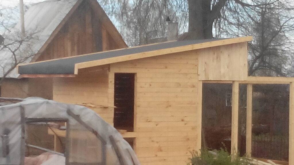 Так же на фото видим, что брусья длиннее чем сам курятник – это место для гнезд.