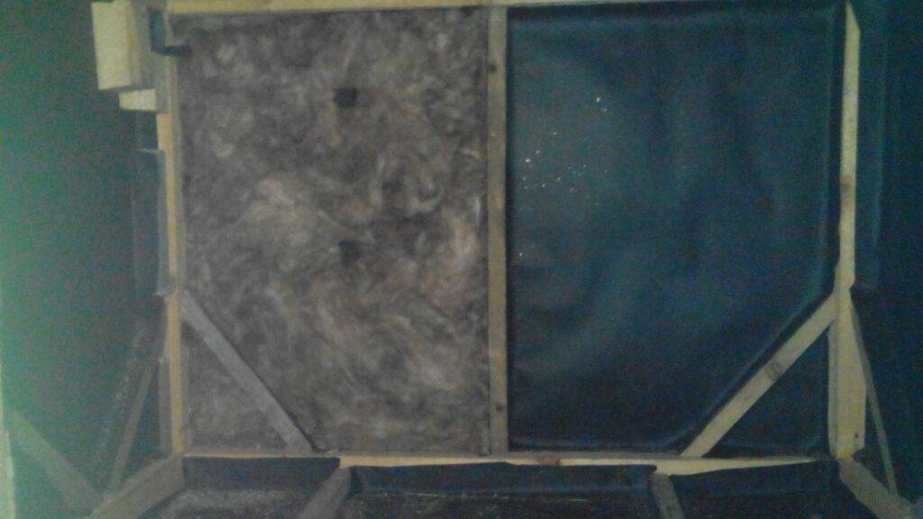 Вырезать две одинаковые детали (прямоугольники 2500-3000×1400 мм). Одну из них забить наглухо к задней верхней боковой стороне. Вторую прикрепить петлями к коньку или к среднему брусу для организации откидной дверцы. Можно разрезать ее пополам и сделать два люка.