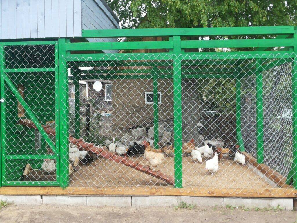 Размеры курятника на 10-20 кур с выгулом — длина 6 м, ширина 4 м, высота 3,5 м.