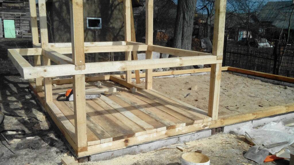 Укладываем на блоки гидроизоляционный материал – бикрост первый слой, далее подготовленные по размеру (100х100) деревянные брусья. Для предотвращения гниения древесины обрабатываем антисептиком.