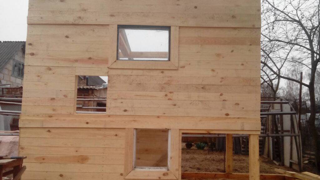 Стена второго этажа, но так же готовили и место для окошка второго этажа, и выход для курей. Окно вокруг сделали красивой отделкой, так же что бы меньше было щелей.