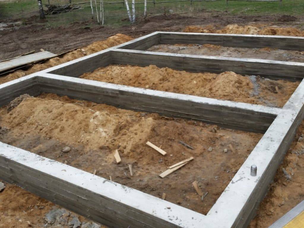 Чтобы фундамент под зданием был крепким и надежным, выкапывают траншею, глубина которой составляет от 40 до 50 см, а ширина — не менее 30 см. Внутрь траншеи закладывают брусья (100 на 100 мм). Расстояние между ними — 15-20 см. Конструкцию заливают цементом, смешенным с песком в пропорции 1 к 3. После застывания фундамента начинают зашивать стены.