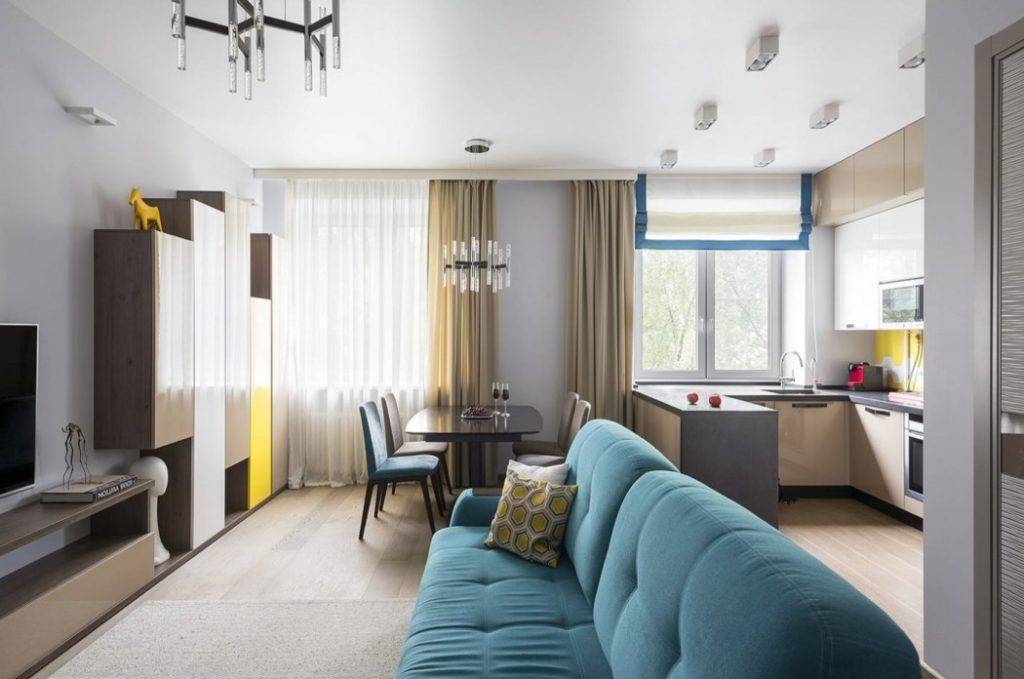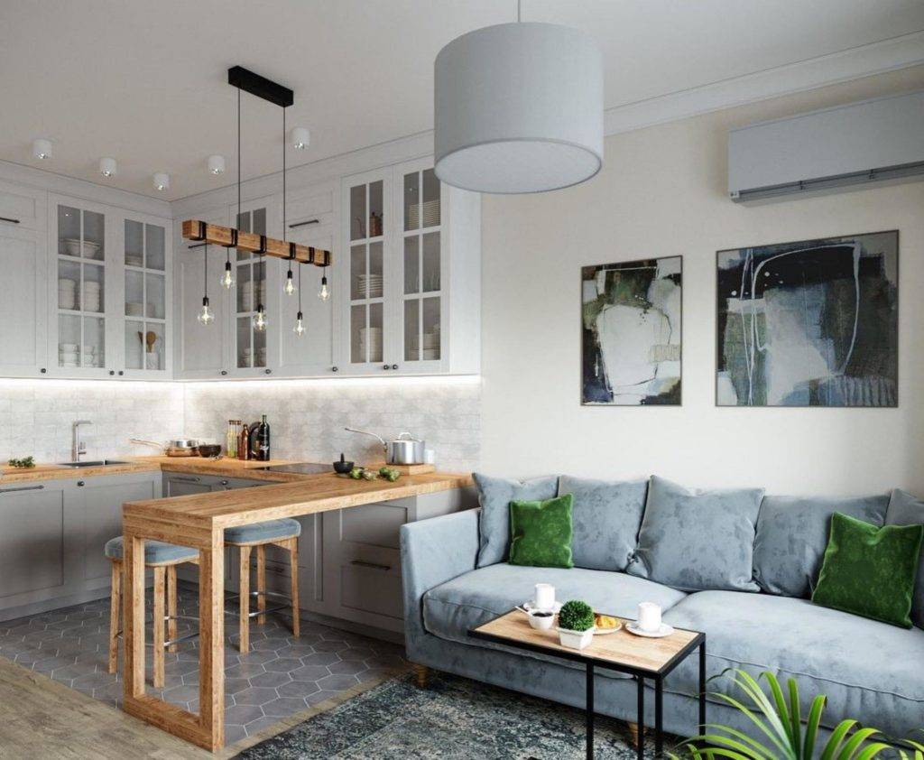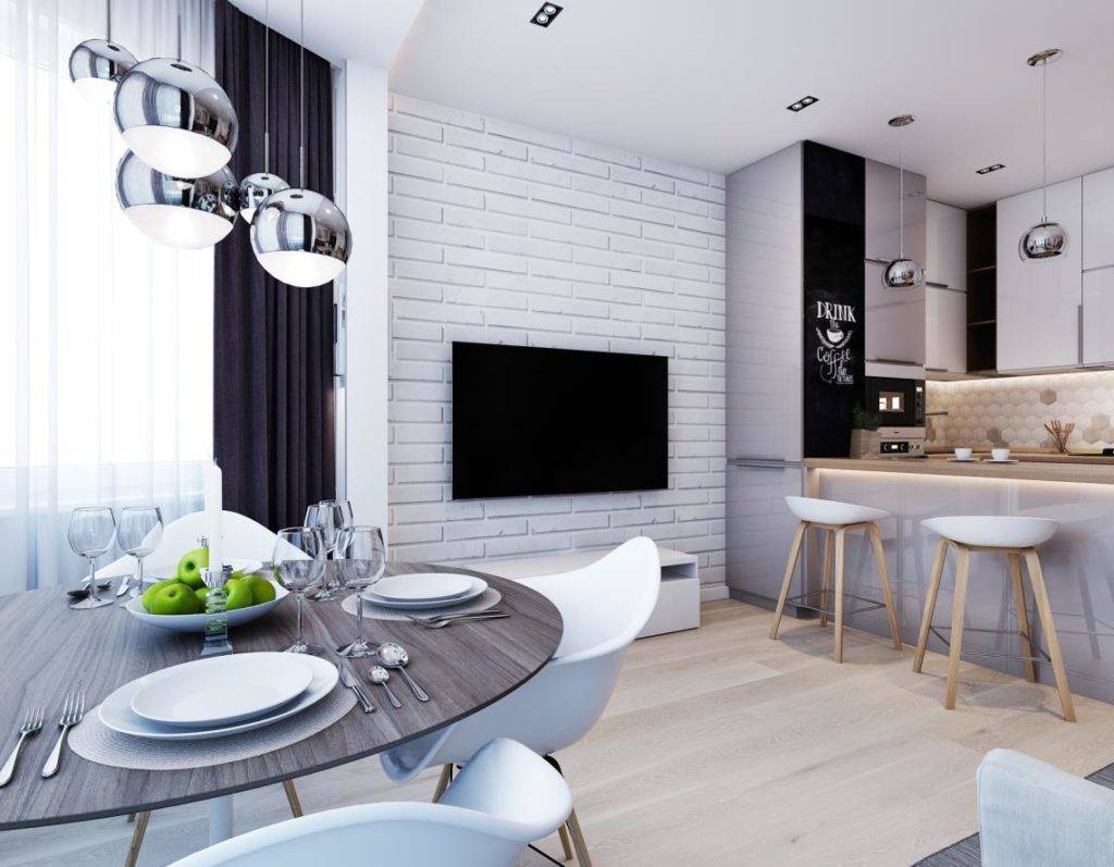Освещение имеет огромное значение. Если допустить ошибку, попечение станет мрачным и холодным. Совмещение гостиной и кухни предполагает создание рабочего участка, обеденного сегмента и места для отдыха. Для каждой области следует подбирать индивидуальное освещение. Никакой люстры на стыке сегментов. Подобное решение выглядит безвкусно.