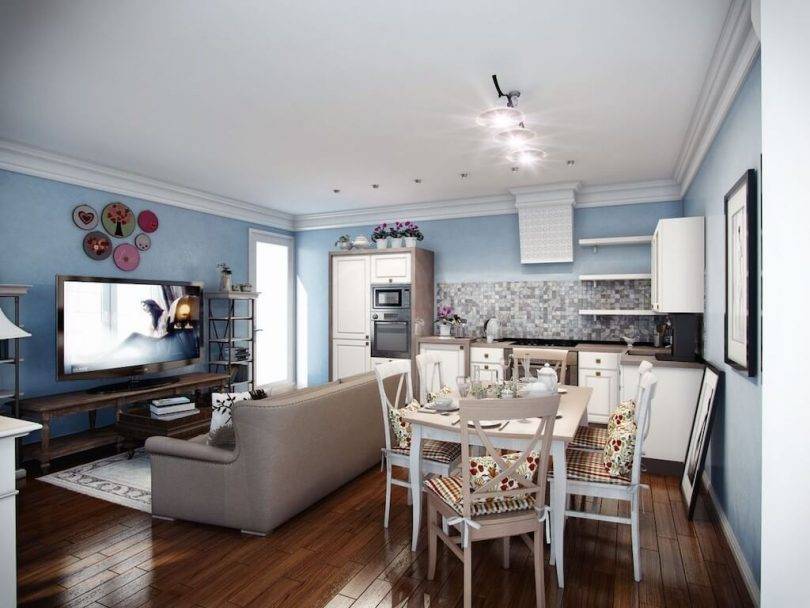 Отделка стен может выполняться различными материалами: окрашивание, побелка, наклеивание обоев или панелей. Главное подобрать подходящие расцветки, для резкого или плавного перехода. В кухоньке используют материалы, которые просто моются и не впитывают загрязнения. Для зала подойдут любая отделка с различными принтами или фотообоями.