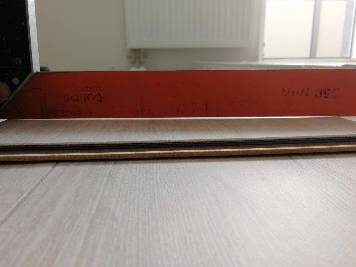 Третий момент, на фотографии видно, как планку Classen повело — она оказалось выгнутой, что не может способствовать увеличению срока службы напольного покрытия. По всей видимости, Классен меняет форму из-за отсутствия компенсирующего слоя снизу.