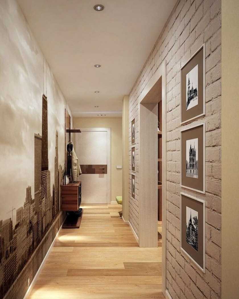 Если помещение вытянутое, визуально расширить его можно зеркалами, светлыми оттенками или фотообоями.