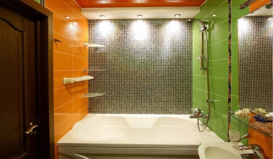 А вот на потолке можно и сэкономить. Его лучше всего сделать ровным и одноуровневым. Это может быть натяжная конструкция, отделка панелями или простая покраска. В этом случае он не будет обращать на себя особого внимания, а сделать дизайн оригинальным поможет декор и плитка на стенах и полу.