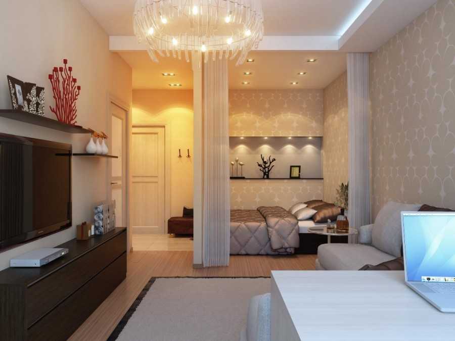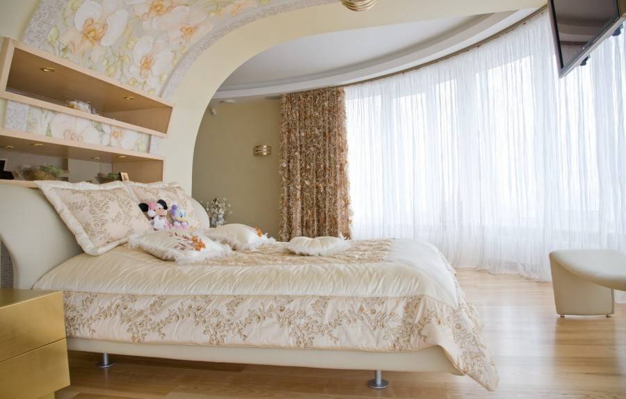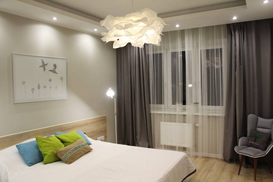 Спальня или спальня-гостиная должна формироваться с учетом зонирования пространства. Можно сделать перепады уровней, чтобы выделить спальную зону, рабочий кабинет, обеденную зону и т.д. Желательно продумать расположение мебели и зон до начала ремонта, чтобы точно знать, как действовать.