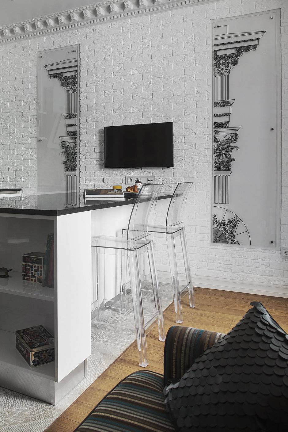 В ходе ремонта кухню и гостиную объединили, оставив между этими помещениями широкий проем. А над ним дизайнеры разместили большой экран – стоит его опустить и гостиная превращается в кинозал.