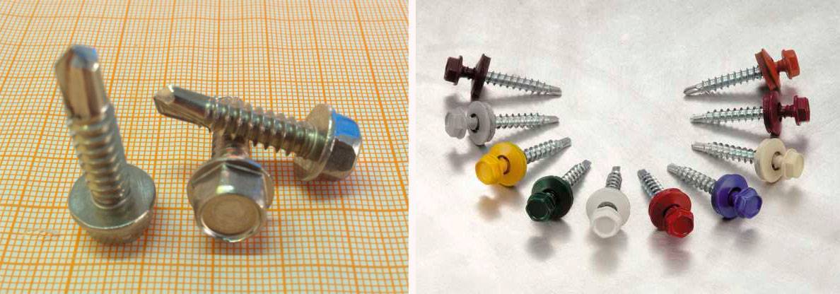 Кровельные крепежи обладают сверловым концом, шестигранной шляпкой и резиновой прослойкой. Последний элемент играет очень важную роль. Это не только дополнительный уплотнитель для крепления, но и изолирующая прокладка, которая не дает влаге подтекать под кровлю через входное отверстие самореза. Подобные крепежи предлагаются в широкой цветовой гамме и могут быть длиной от 19 до 100 мм.