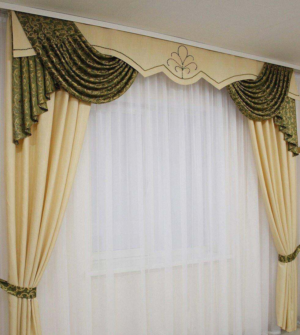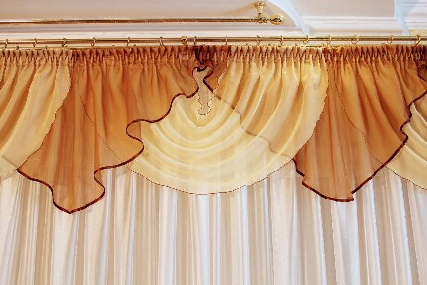 Такая традиционная модель чаще всего выглядит как уложенный красивыми волнами равносторонний кусок материала. Нижнюю часть этого декоративного элемента по желанию можно оставить прямой, придать ей аркообразную форму или фигурно вырезать.