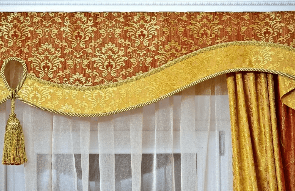 Бисер, стеклярус, тесьма — эффектные способы отделки краев ламбрекена, придающие дополнительную декоративность.
