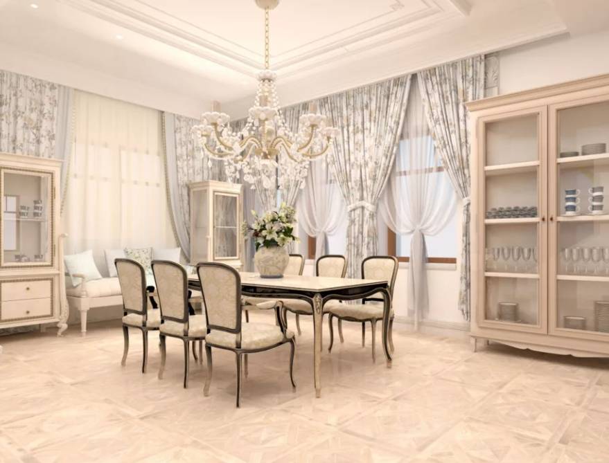 Если добавить налет серебра на фасадах мебели, канделябрах для свечей, люстре, то помещение станет не только воздушным, но и царственно красивым. Посмотрев на фото подобных интерьеров, сразу понимаешь выигрышность такого дизайнерского решения.