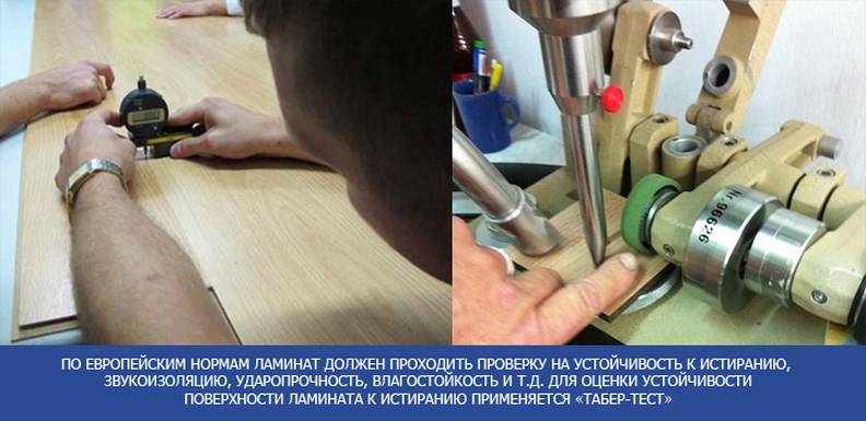 Ламинат, который изготавливается по европейским стандартам, проходит ряд тестов на воздействие влаги, механических и химических повреждений, звукоизоляцию.